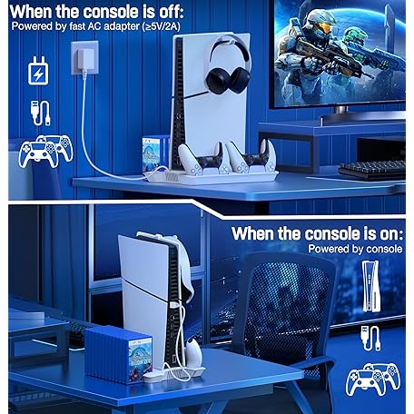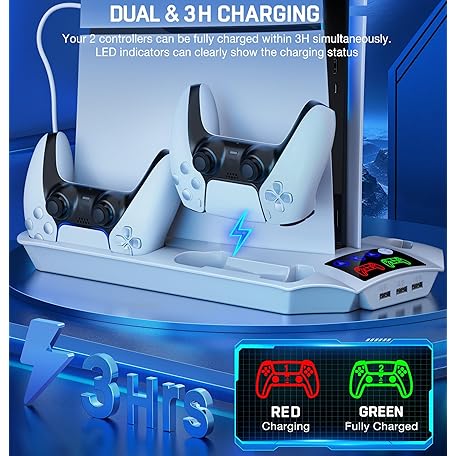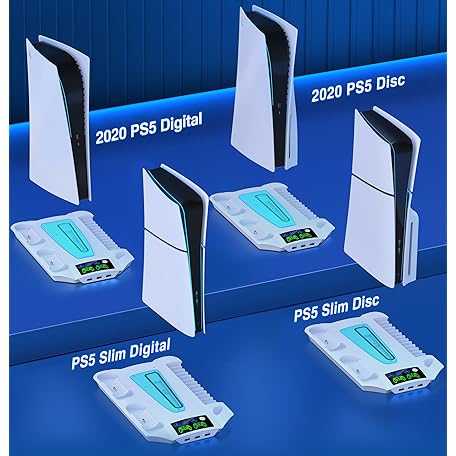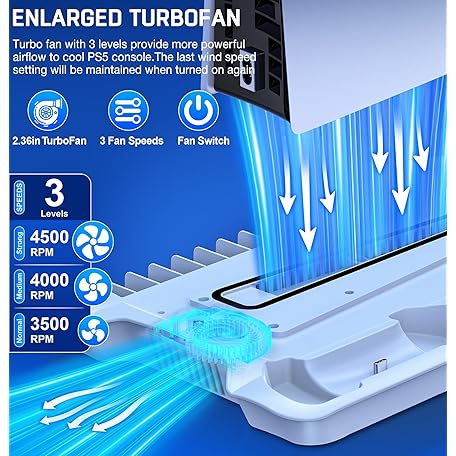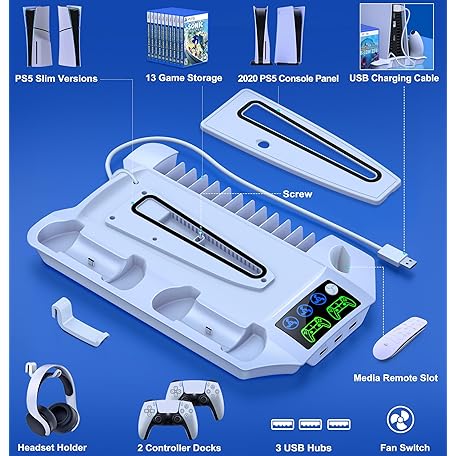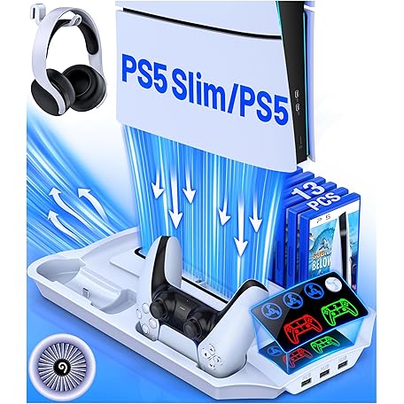 Thông tin sản phẩm PS5 Pro/Slim/PS5 Stand and Cooling Station with Controller Charging Station for Playsation 5 Disc Digital Console, PS5 Accessories Incl. 3 Levels Cooling Fan, 13 Game Slots, 3 USB HUB, Headset Holder