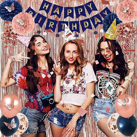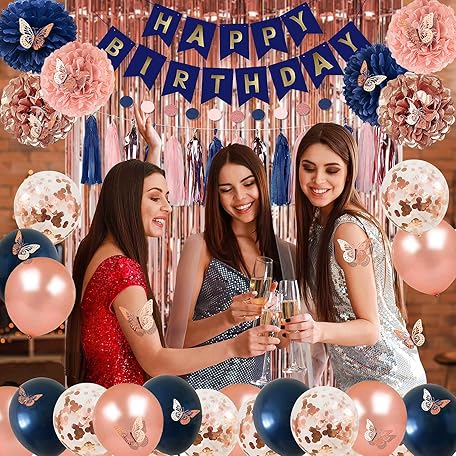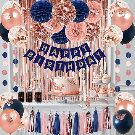 Thông tin sản phẩm Pugkloy Rose Gold and Navy Blue Birthday Party Decorations with Happy Birthday Banner, Curtains, Butterfly Wall, Circle Dots Garland, Tissue Pompoms, Paper Tassels for Her