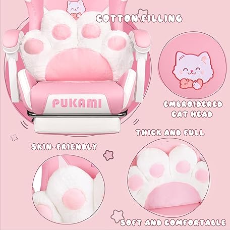 Thông tin sản phẩm PUKAMI Pink Gaming Chair Cute with Cat Ears and Cat Paw Lumbar Cushion, Ergonomic Computer Chair for Girl with Footrest and Headrest, Comfortable Reclining PC Game Chair for Adult, Teen, Pink