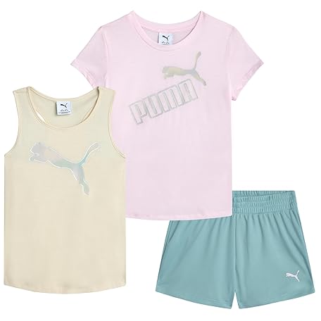 PUMA Girls Active Shorts Set - 3 Piece Performance T-Shirt, Tank Top, Gym Shorts - Summer Athletic Outfit for Girls (7-14)