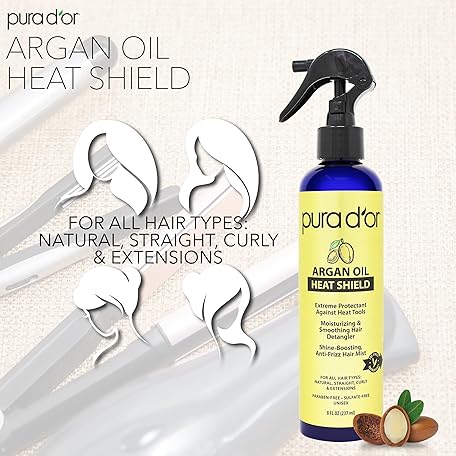 Thông tin sản phẩm PURA D'OR 8 Oz Argan Oil Heat Shield Protectant Spray with Select Organic Ingredients, Protects Up To 450º F From Flat Iron & Hot Blow Dry, Leave-In, Define & Shine Dry & Damaged Hair