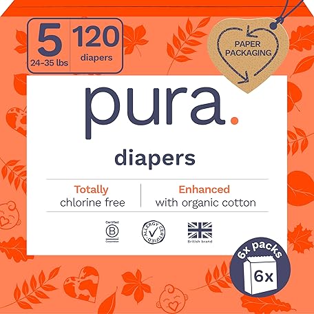 Thông tin sản phẩm Pura Size 5 Eco-Friendly Diapers (24-35 lbs) Totally Chlorine Free (TCF), Hypoallergenic, Soft Organic Cotton, Sustainable, up to 12 Hours Leak Protection, Allergy UK, 6 Packs of 20 (120 Diapers)