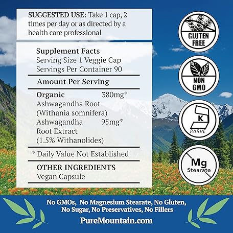 Sản phẩm Pure Mountain Botanicals Ashwagandha Capsules - 90 Kosher Vegan Caps with 475mg Organic Ashwagandha Root & Potent Ashwagandha Extract đang được bán với giá ưu đãi là $25.9093 tại nước Mỹ.