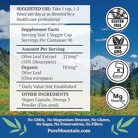 Sản phẩm Pure Mountain Botanicals Olive Leaf Extract Capsules - Kosher Vegan Caps Now with 400mg Organic Olive Leaf and Potent Extract Supplement đang được bán với giá ưu đãi là $26.9993 tại nước Mỹ.