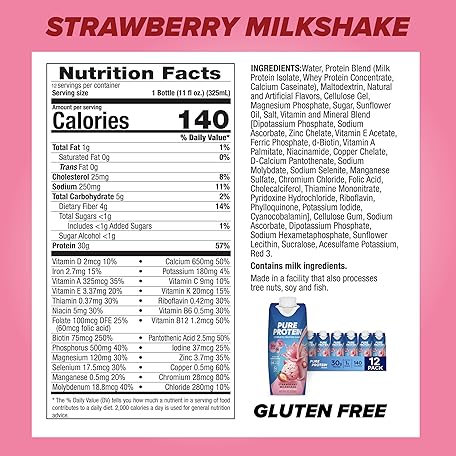 Thông tin sản phẩm Pure Protein Strawberry Protein Shake, 30g Complete Protein, Ready to Drink and Keto-Friendly, Vitamins A, C, D, and E plus Zinc to Support Immune Health, 11oz Bottles, 12 Pack