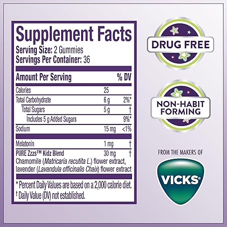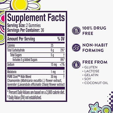 Thông tin sản phẩm PURE Zzzs Kidz, Kids Melatonin Gummy, Sleep Aid, Low Amount of Melatonin for Kids, with Chamomile and Lavender, Melatonin 1 mg, Melatonin Gummies Kids, Berry Flavored, 72 Sleep Gummies