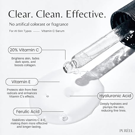 Thông tin sản phẩm Puréel 20% Vitamin C Serum for Face – Brightening Serum with Vitamin E & Ferulic Acid – Anti-Aging, Dark Spot Remover, Even Skin Tone, Wrinkle Reduction & Radiant Glow – 1 fl oz