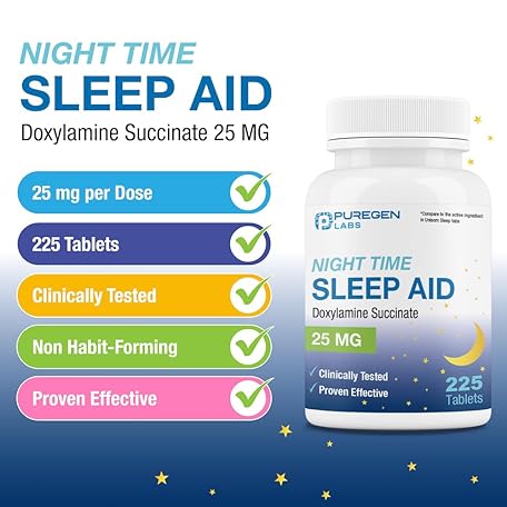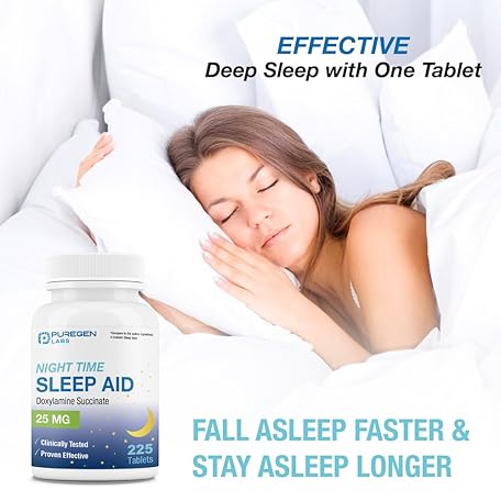 Puregen Labs Doxylamine Succinate 25mg | Nighttime Sleep Aid | Safe & Effective | Non-Habit Forming Sleep Aid | Made in USA | 225 Tablets
