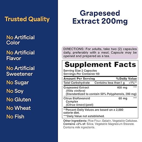 Thông tin sản phẩm Puritan's Pride Grapeseed Extract 200mg, Dietary Supplement for Antioxidant and Heart Health Support, 2 Month Supply, 120 Rapid Release Capsules