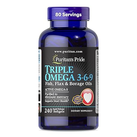 Thông tin sản phẩm Puritan's Pride Premium Triple Active Omega 3-6-9 Fish, Flax, and Borage Oils, Dietary Supplement for Heart, Joint, and Cellular Health Support, 240 Rapid Release Softgels