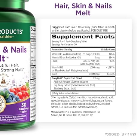 Sản phẩm Purity Products Hair, Skin + Nails Melt 1000mcg B-12 + 2500mcg Biotin Energy Berry Melt - Delicious Berry Lemonade Flavor w/Super Fruits - B12 Methylcobalamin - 30 Melting Tablets đang được bán với giá ưu đãi là $21.7455 tại nước Mỹ.