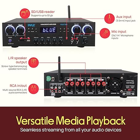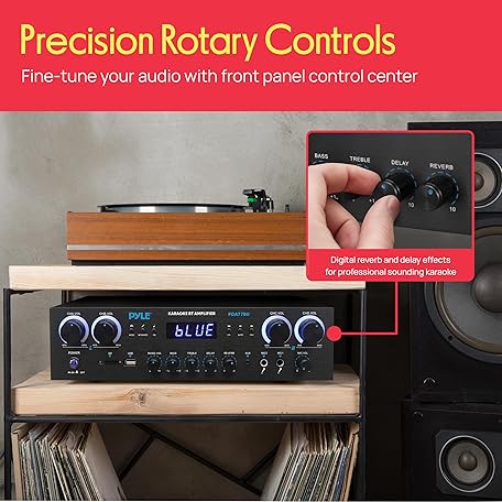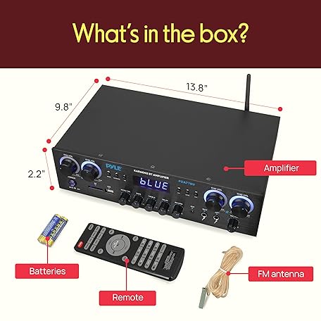 Thông tin sản phẩm Pyle Bluetooth Home Stereo Amplifier Receiver - 4 Channel, 800 Watt Karaoke Sound System w/ MP3,USB,SD,AUX,RCA,FM,MIC, Headphone, Reverb + Delay, LED Vol, for Home, Studio, Theater Speakers - PDA77BU