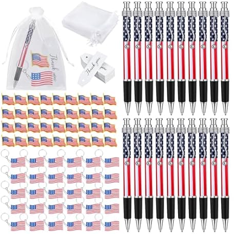 Qilery 250 Pcs Veterans Day Style American Flag Lapel Pins Ballpoint Pen Black Independence Day Flag Keychains Thank You Card Organza Gift Bag for Home Office School 4th of July Party Supplies