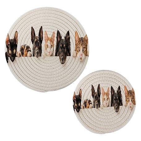 Qilmy A Group of Silly and Cute Cats and Dogs Trivets Pot Holders 2PCS, Hot Pads, Table Mats,Placemats Set for Cooking and Baking,Cotton Braided Hot Pads704