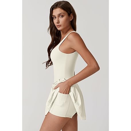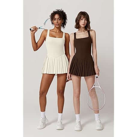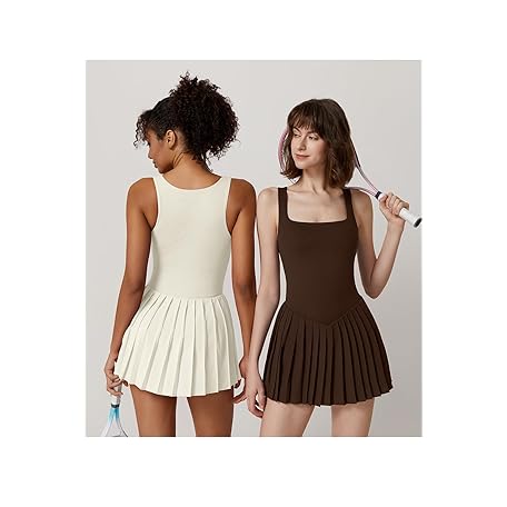 • QINSEN Womens Square Neck Tennis Dress Pleated Sleeveless Built in Shorts Golf Athletic Dress with Pockets