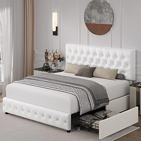 Queen Bed Frame with 4 Storage Drawers and Adjustable Headboard, Upholstered Faux Leather Platform Bed with Button Tufted Design, Strong Wooden Slats Support, No Box Spring Needed, White