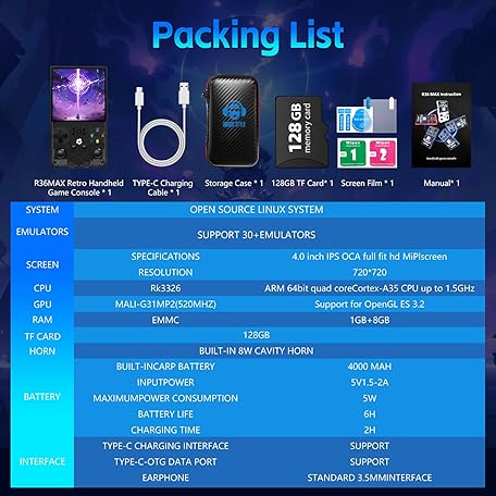• R36MAX Retro Game Console, 4.0 inch Retro Gaming Console with 128GB Memory, Video Game Consoles with 4000mAh Battery and 30+ Emulators, Ink Black