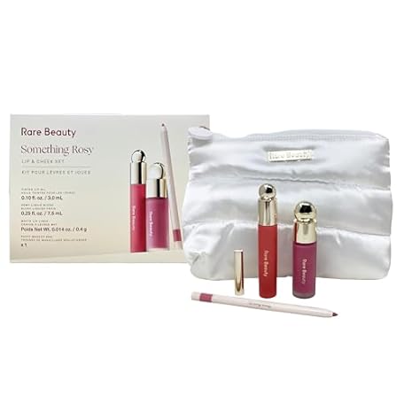 Rare Beauty Limited Edition Something Rosy Lip & Cheek Set - Liquid Blush, Lip Oil & Lip Liner with Puffy Makeup Bag