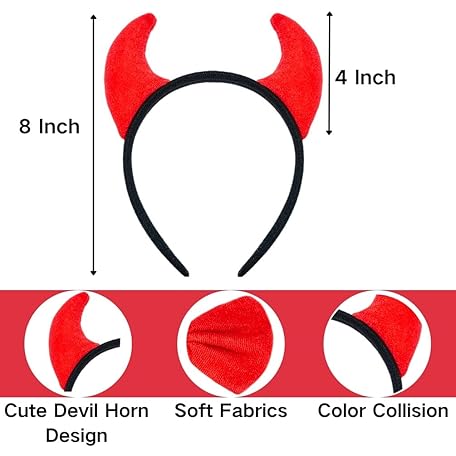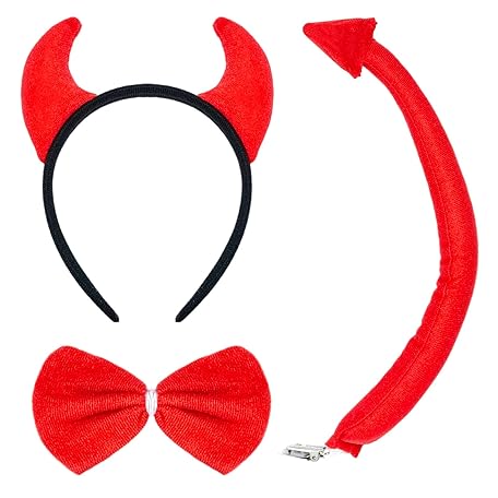 Red Devil Horns Headband and Tail with Bowtie – Devil Costume Accessories for Women and Men, Halloween Devil Horns and Tail Set