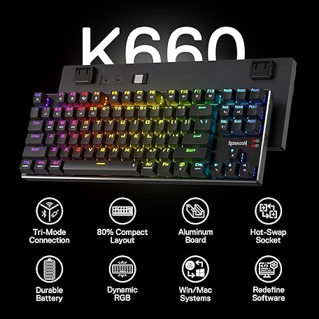 Thông tin sản phẩm Redragon K660RGB-PRO (K556 TKL) Wireless Gaming Keyboard, 80% 87 Keys BT/2.4Ghz Tri-Mode Aluminum Mechanical Keyboard w/Mac Function Keys, Hot-Swap Sockets & Noise Absorbing Form, Red Switch