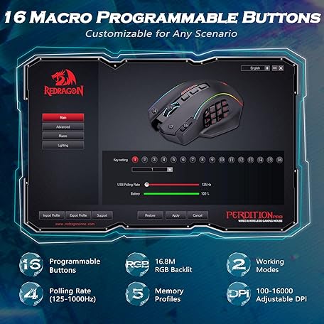 Thương hiệu Redragon là cái tên nổi tiếng được rất nhiều khách hàng trên thế giới chọn lựa. Với kiểu dáng đẹp mắt, sang trọng, sản phẩm Redragon Wireless Gaming Mouse, MMO Gaming Mouse UP 16,000 DPI, 16 Macro Programmable Buttons, RGB Rechargeable Mouse with 12 Side Buttons, 70Hrs for PC Laptop MOBA FPS, White,M901P-WS là sự lựa chọn hoàn hảo nếu bạn đang tìm mua một món cho riêng mình.