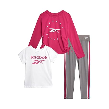 Reebok Active Girls Leggings Set - 3 Piece Athletic Crew Neck Short Sleeve TShirts Sweatshirt and Legging Pants for Girls