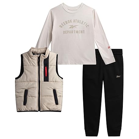 Reebok Baby Boys Pants Set - 3 Piece Zip Puffer Vest Jersey Long Sleeve Shirt & Fleece Boys Joggers for Infant Toddler & Kids