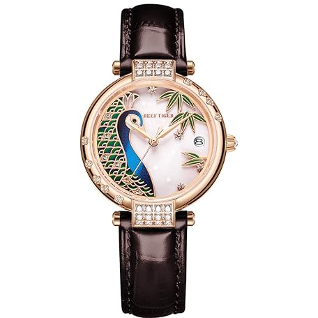 REEF TIGER Brand Luxury Gold Rose Women Pink Dial Automatic Peecock Watches with Calfskin Strap RGA1587