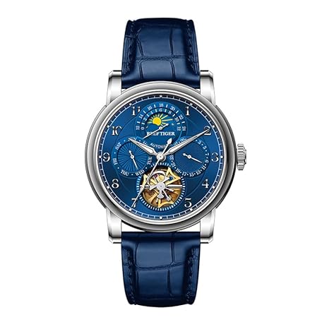 REEF TIGER Luxury Automatic Watch, Rose Gold Case, Brown Leather Band, Moon Sun Display