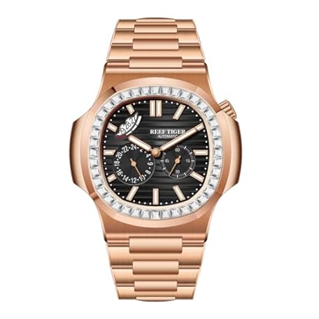 REEF TIGER Luxury Automatic Watch, Rose Gold Stainless Steel, Crystal Bezel, Black Dial