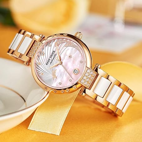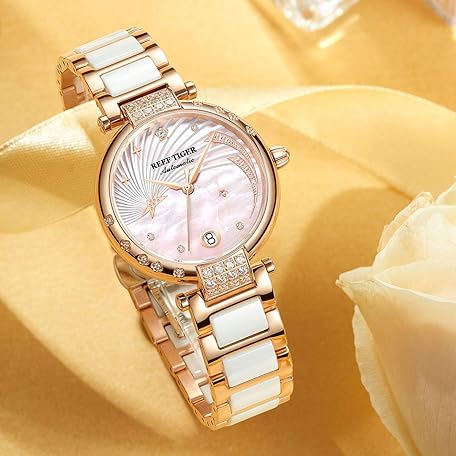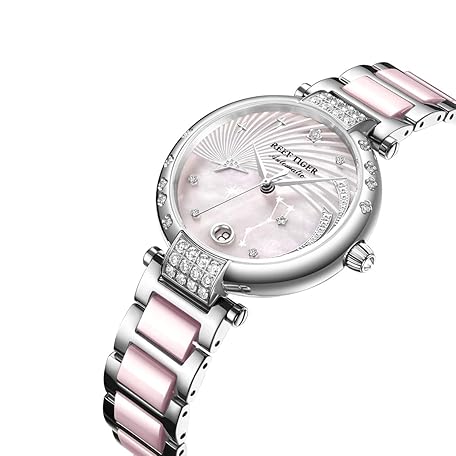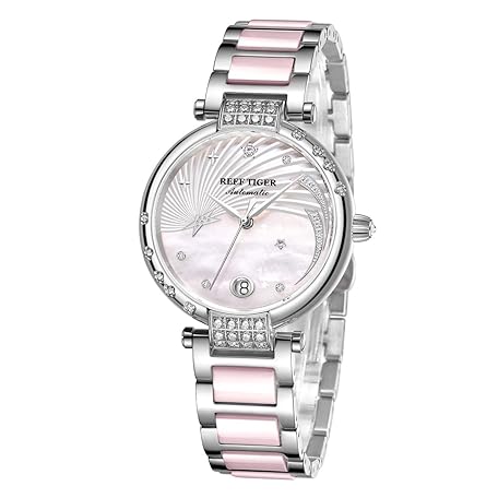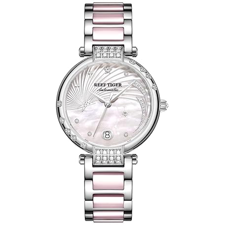• REEF TIGER Luxury Brand Pink Automatic Calendar Watch Women Watch Diamond Ceramic Wrist Watches RGA1592
