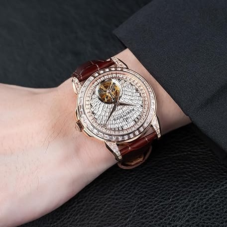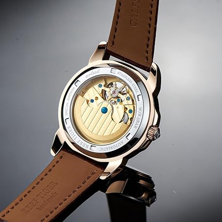 REEF TIGER Luxury Watch, Diamond Pattern Dial, Automatic Movement, Black Leather Band