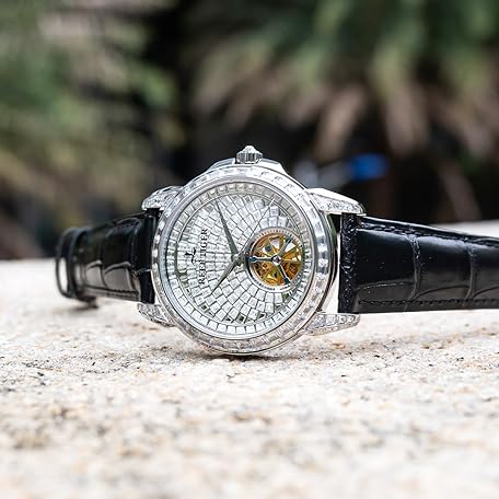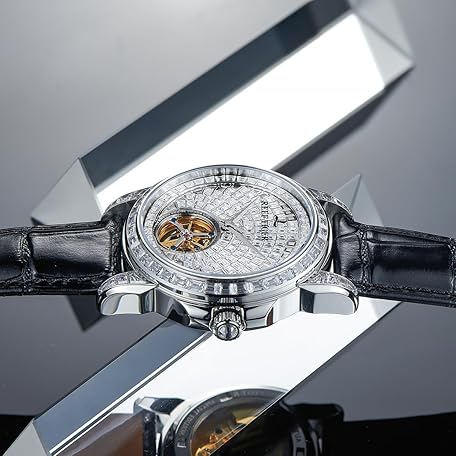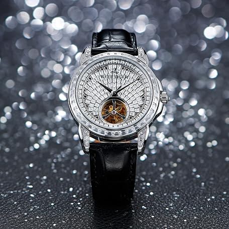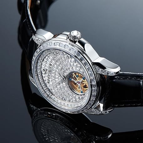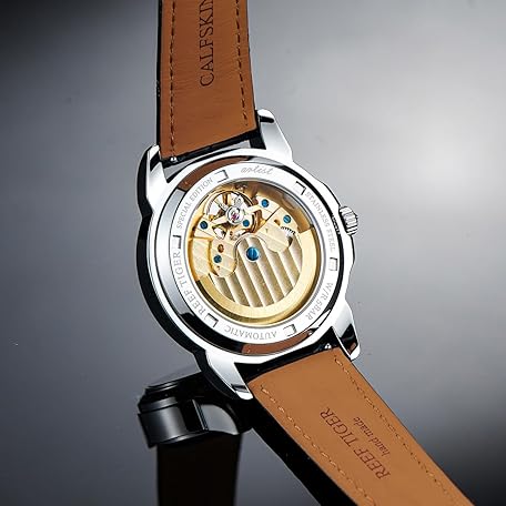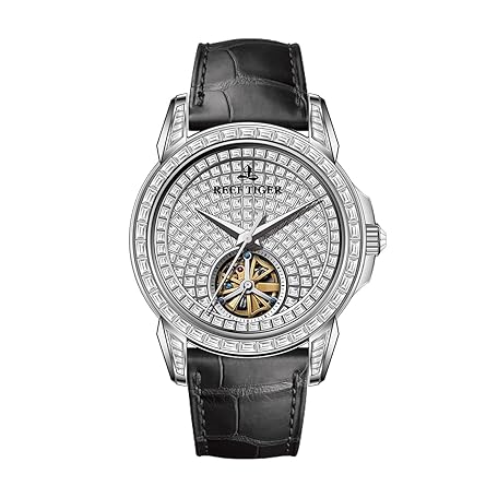 REEF TIGER Luxury Watch, Diamond Pattern Dial, Automatic Movement, Black Leather Band