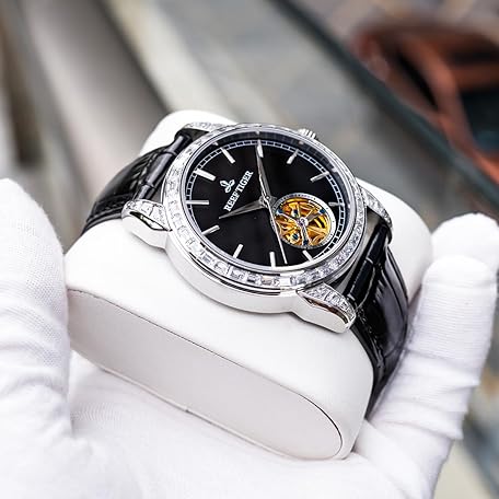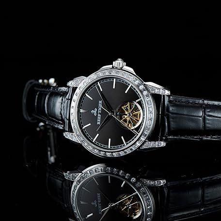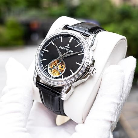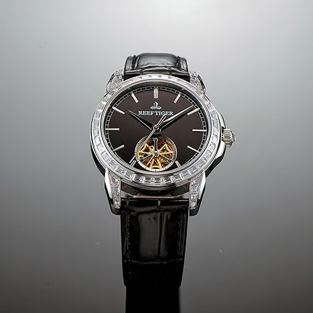 REEF TIGER Luxury Watch, Rose Gold Case with Crystal Bezel, Brown Leather Band, Automatic Movement