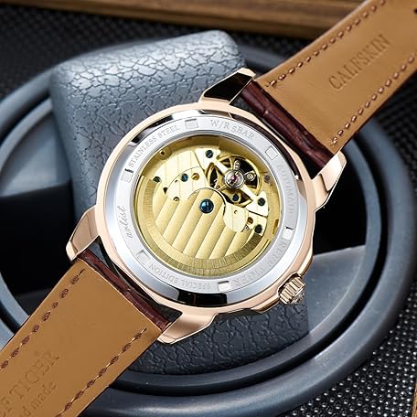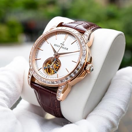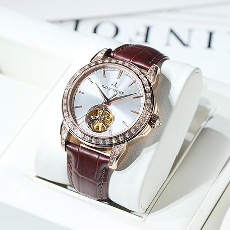 REEF TIGER Luxury Watch, Rose Gold Case with Crystal Bezel, Brown Leather Band, Automatic Movement
