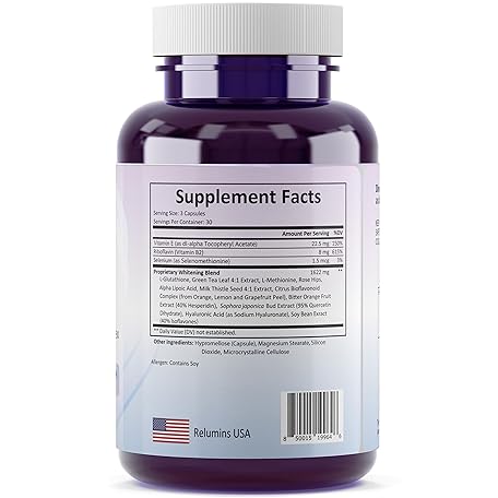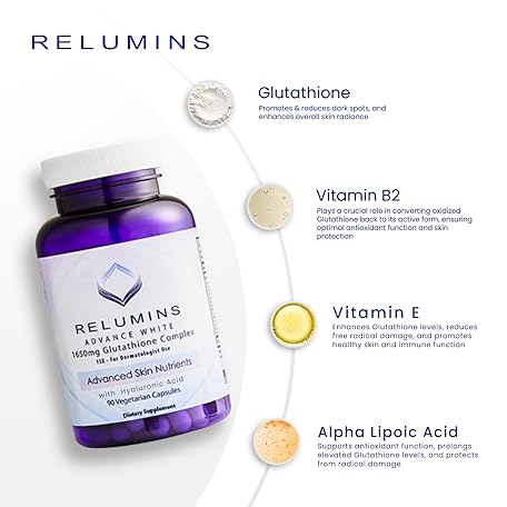 Thông tin sản phẩm Relumins 1650mg L-Glutathione Complex with Hyaluronic Acid, Alpha Lipoic Acid, Rose HIPS, Vitamin E & Riboflavin – Antioxidant Support, Perfect for Achieving a Holiday Glow, Made in USA – 90 Capsules