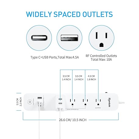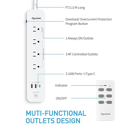Remote Control Power Strip with 3 USB Surge Protector Power Strip with 3 RF Controlled Outlets, 5ft Extension Cord, 15A/1875W Remote Control Outlet for Household and Workstation Appliances