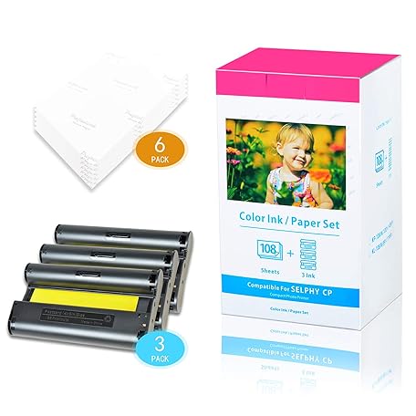 Replacement KP-108IN Color Ink/Paper Set (4 x 6 inch 108 Ink Paper Sheets + 3 Color Ink Cassette) Compatible for Canon SELPHY CP1300 CP1500 CP1200 Wireless Compact Photo Printer