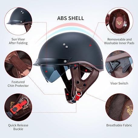 • Retro Motorcycle Helmets for Men Women Open Face Helmets Sun Visor Quick Release Buckle MM107 DOT Approved Half Face Crusier Helmet (Matte Black, L)