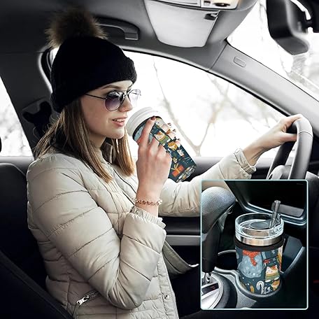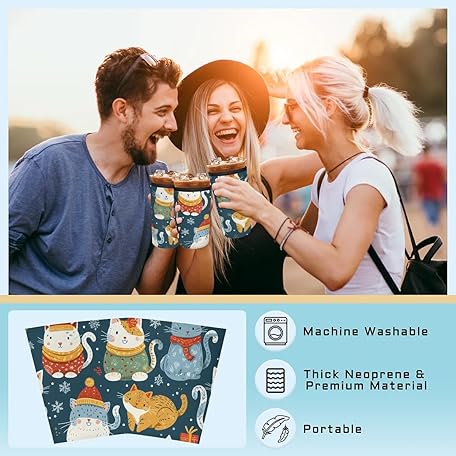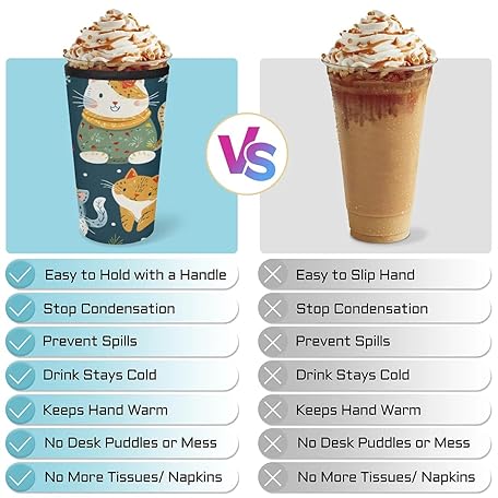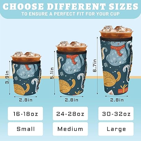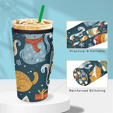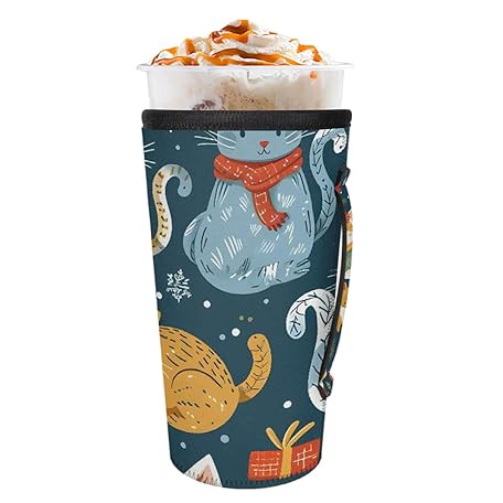 Reusable Iced Coffee Sleeve Neoprene Coffee Sleeves with Handle for Starbucks & Dunkin Cups Fits 16-32 oz Gifts for Coffee Lovers Women Winter Christmas Cat