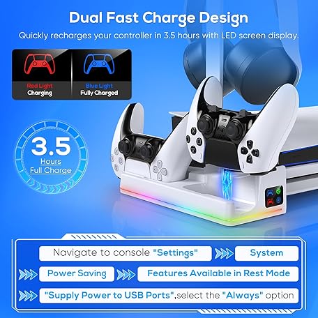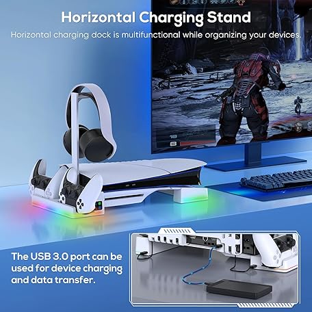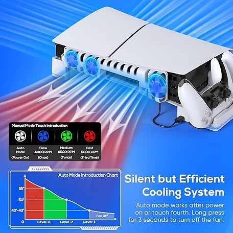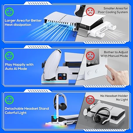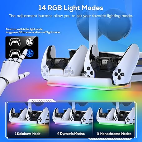 Thông tin sản phẩm RGB Horizontal Cooling Station Stand for PS5 Slim /Pro Console with 2 Controller Charger, Auto Silent Cooling Fan for Playstation 5 Slim /Pro Disc &Digital with 14 Light Modes and Headset Holder