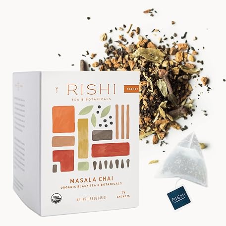 Thông tin sản phẩm Rishi Tea Masala Chai Black Sachet Tea Bag Blend - Organic, Assam with Whole Spices, Energizing & Caffeinated - 15 Count (Pack of 1)