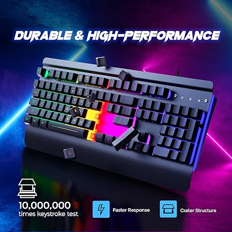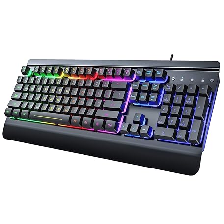 Thông tin sản phẩm RisoPhy Gaming Keyboard, 104 Keys All-Metal Panel, Rainbow LED Backlit Silent Computer Keyboard, Wrist Rest, Multimedia Keys, Anti-Ghosting, Waterproof Light Up Wired Keyboard for PC Mac Gamer