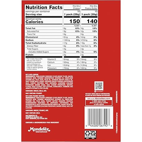 Thông tin sản phẩm RITZ Bits Cheese and RITZ Bits Peanut Butter Sandwich Crackers Variety Pack, Lunch Snacks, 20 Snack Packs