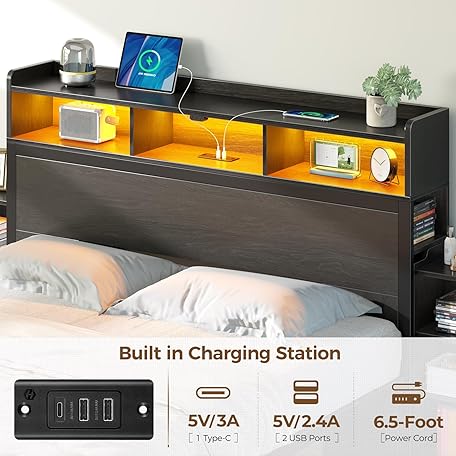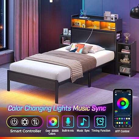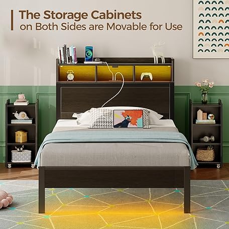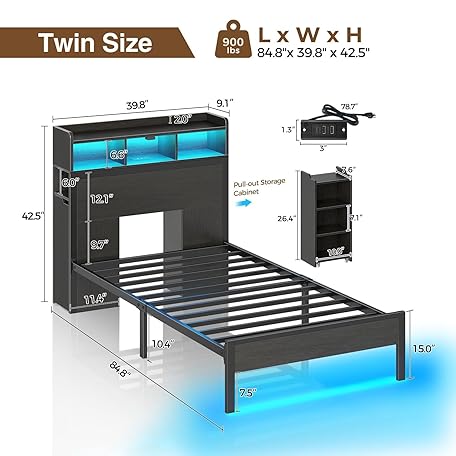 Thông tin sản phẩm Rolanstar Bed Frame Twin Size with Bookcase Storage Headboard, Slide Out Bedside Storage, Bed with Charging Station & LED Lights, Heavy Duty Metal Slats, No Box Spring Needed, Noise Free, Black