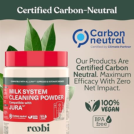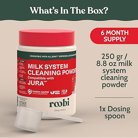 • Roobi Compatible Milk System Cleaning Powder for Jura. Specially formulated for Jura Automatic Espresso Coffee Machines. 100% Vegan, Carbon Neutral.