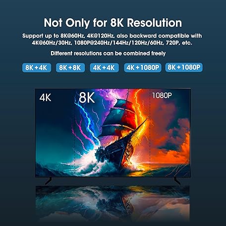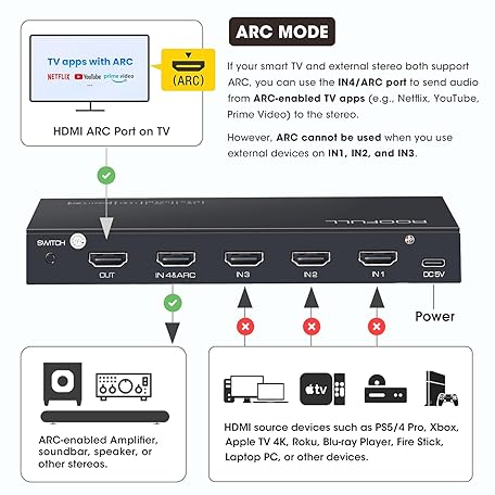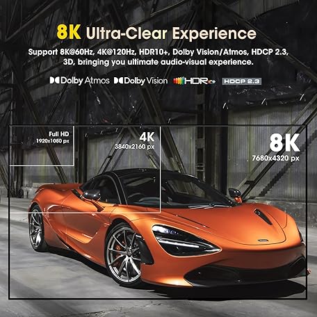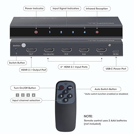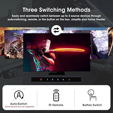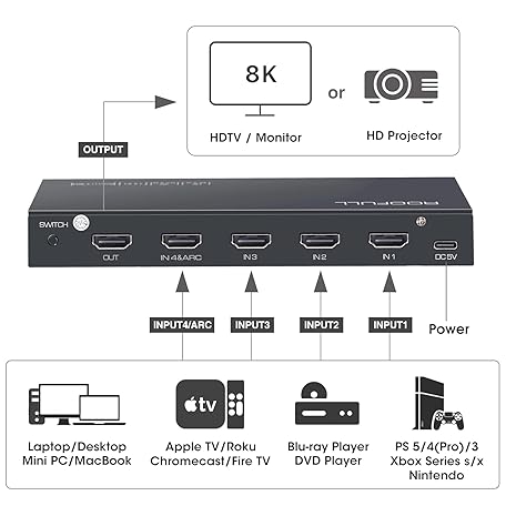 ROOFULL 4 in 1 Out 8K HDMI 2.1 Switch 4 Port 8K@60HZ 4K@120Hz HDMI Switcher Box with Remote Support 48Gbps HDR10+ Dolby Vision/Atmos HDCP 2.3 CEC for PS5 Xbox Roku Fire Stick Blu-ray Player Gaming PC
