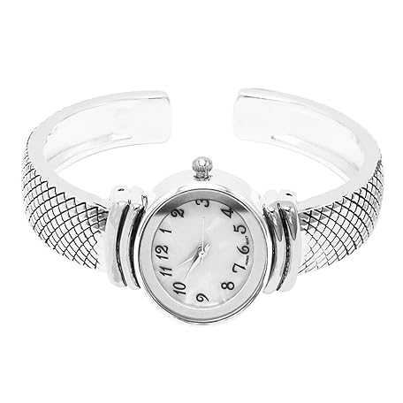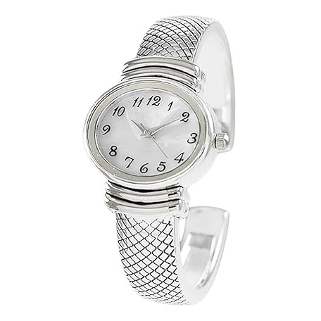 Rosemarie Collections Women's Stylish Oval Shaped Mother of Pearl Face and Textured Cuff Watch Bracelet (Silver)