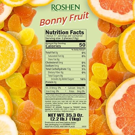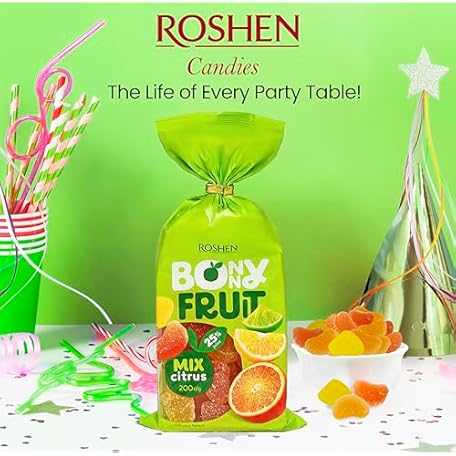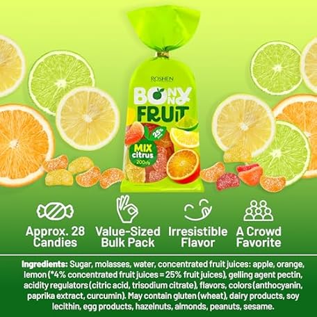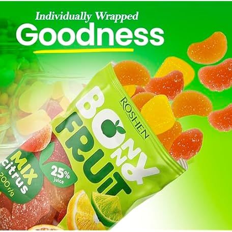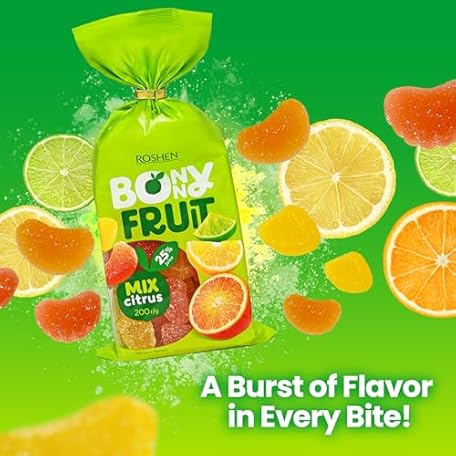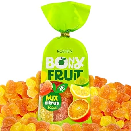 Roshen Bonny-Fruit Jelly Candy, Citrus Mix, Orange, Grapefruit & Lemon-Lime Shapes, 7.05 oz (200g), 25% Juice, Approx. 28 Jellies, Soft Fruit Gems
