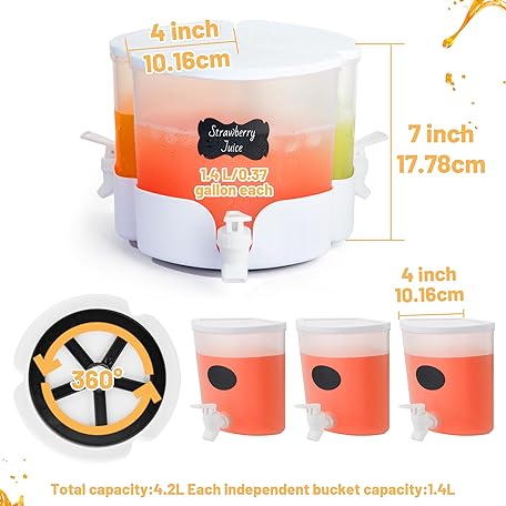 Rotatable 360° 4.2L Beverage Dispenser for Fridge, 3 Grids Plastic Drink Dispenser with 3 Spigots, 3 Coasters and 24 Labels, for Lemonade, Tea, Milk